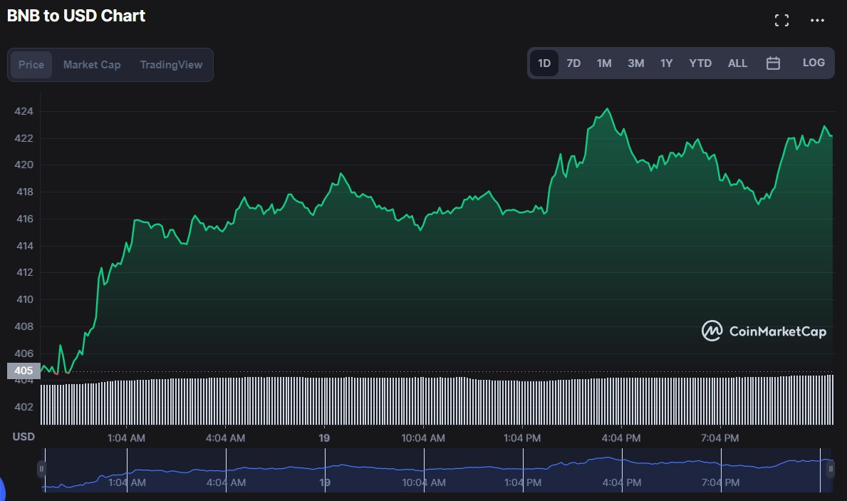 Khối lượng giao dịch 24h của BNB tăng hơn 24%, dao động quanh mốc 2 tỷ USD. Hiện BNB đứng thứ 4 trên bảng xếp hạng các dự án có vốn hóa lớn nhất thị trường tiền số.