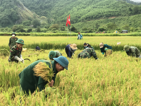 | Giúp nhân dân thu hoạch lúa khi dịch Covid-19 bùng phát trên địa bàn |