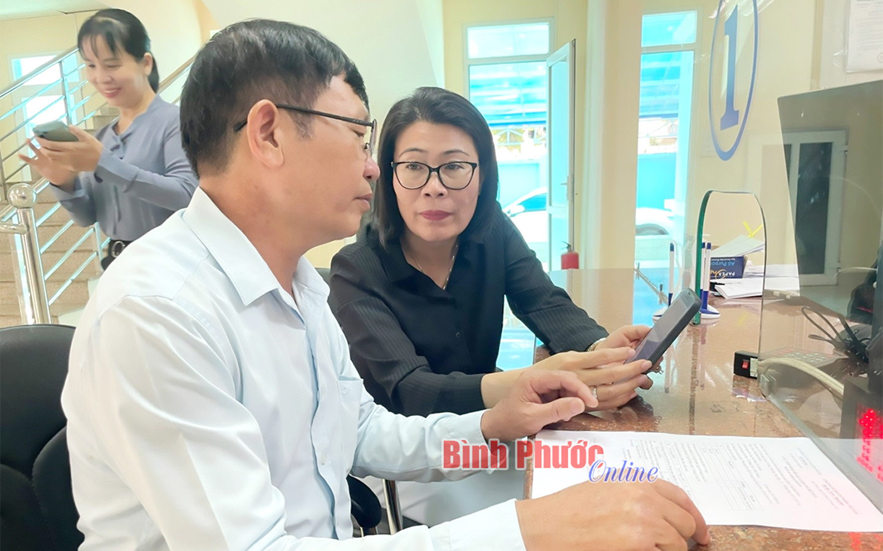Cán bộ Bảo hiểm xã hội tỉnh Bình Phước hướng dẫn người tham gia bảo hiểm cài ứng dụng VssID - bảo hiểm xã hội số để tương tác với cơ quan bảo hiểm mọi lúc, mọi nơi.