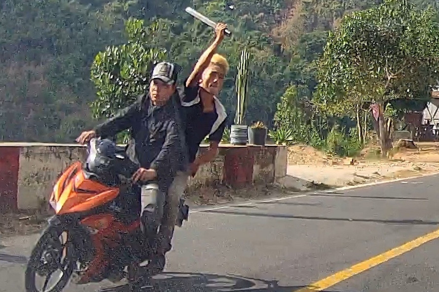 Một thanh niên ngồi sau xe máy bất ngờ vung mã tấu chém vào phía gương chiếu hậu của ô tô. Rất may, tài xế chạy sát lề nên tránh được nhát chém vào xe.