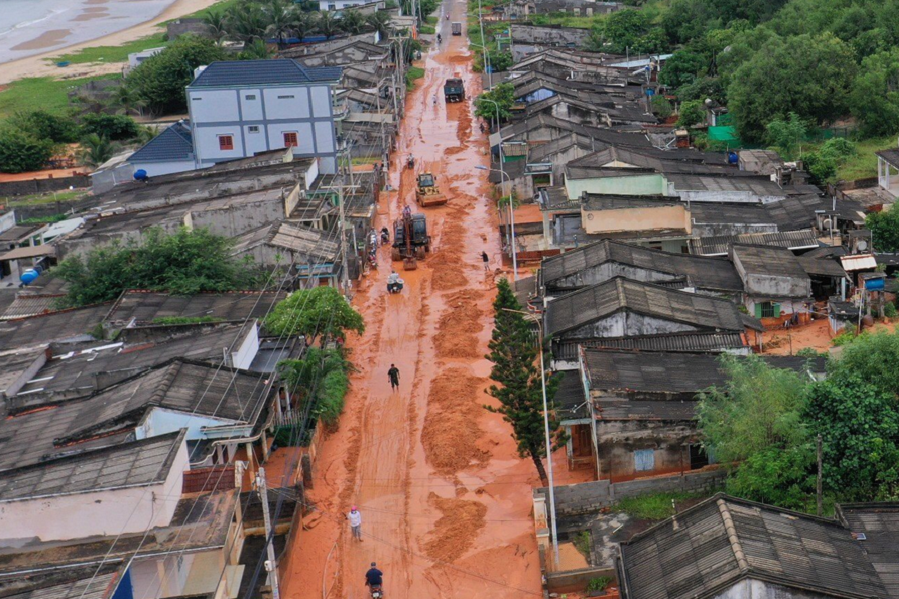 Trận mưa lớn làm lũ cát đỏ từ trên đồi tràn xuống khu dân cư ven biển ở xã Tiến Thành (TP Phan Thiết, Bình Thuận) gây ách tắc giao thông, ảnh hưởng đến cuộc sống người dân.