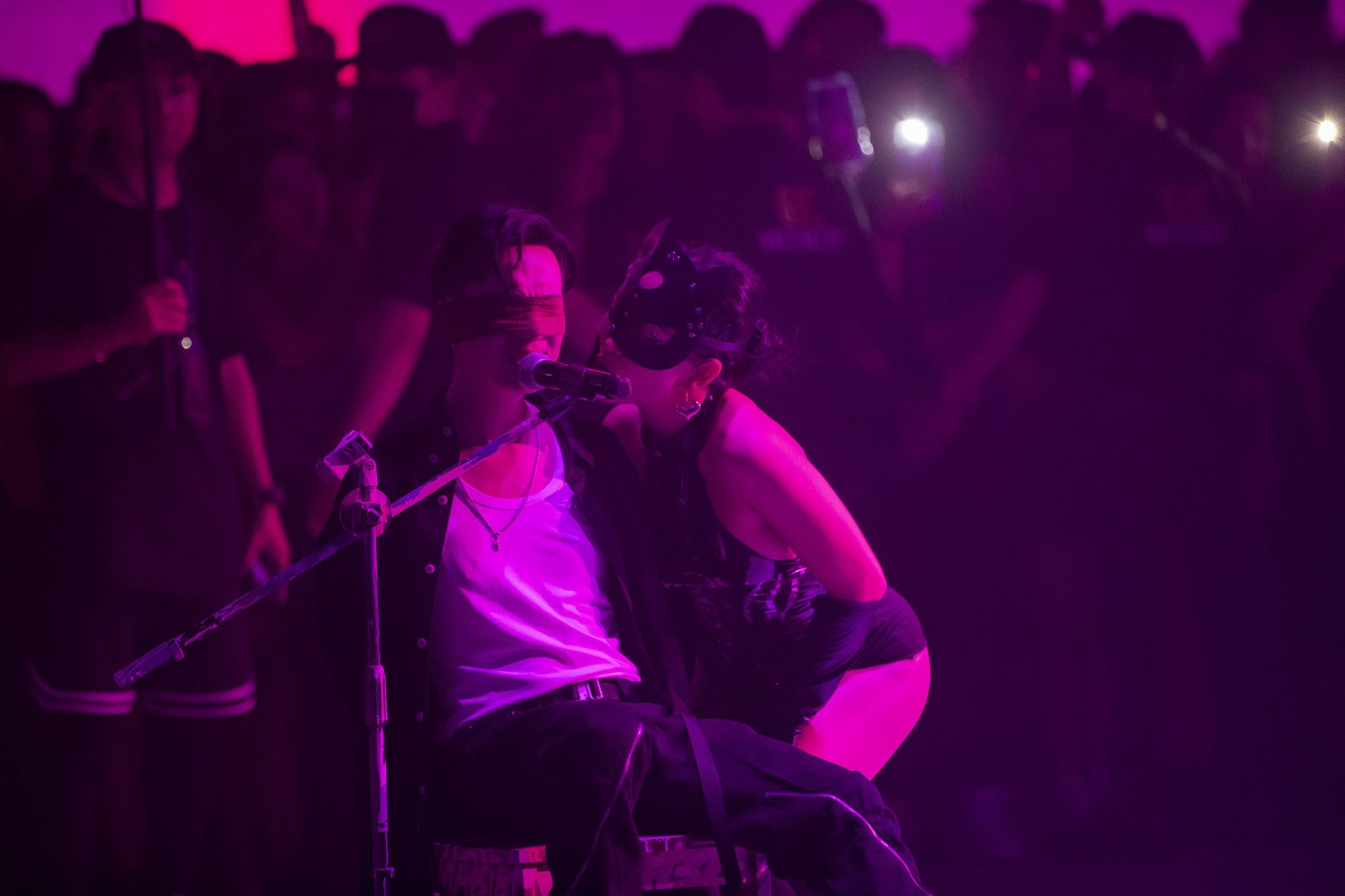 Binz trình diễn bên vũ công mặc đồ ren và nội y táo bạo. |