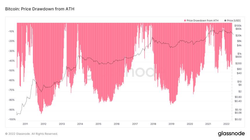 Giá BTC giảm so với mức cao nhất mọi thời đại. Ảnh: Glassnode. |