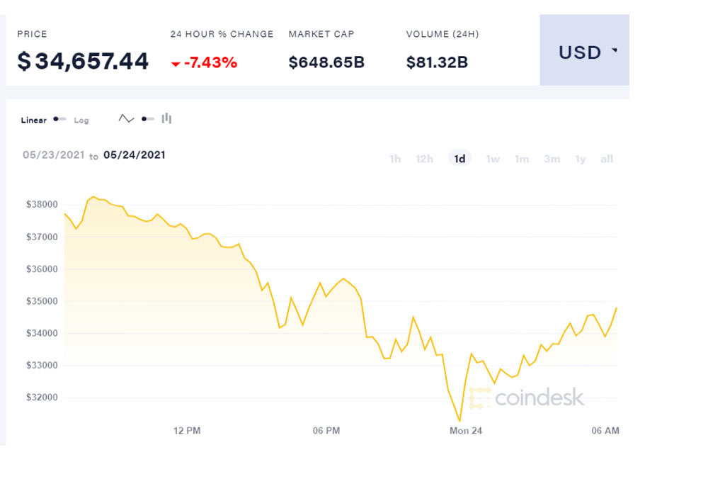 Vào lúc 7h sáng nay (giờ Việt Nam), dữ liệu của CoinDesk cho biết, giá đồng tiền kỹ thuật số lớn nhất thế giới Bitcoin được giao dịch ở mức 34.657,44 USD, giảm 7,43% so với ngày hôm qua. Trong 24 giờ qua, giá Bitcoin không ngừng biến động, thời điểm cao nhất đạt mức 38.308 USD nhưng có thời điểm lại rơi xuống mức thấp nhấp là 31.179,69 USD.