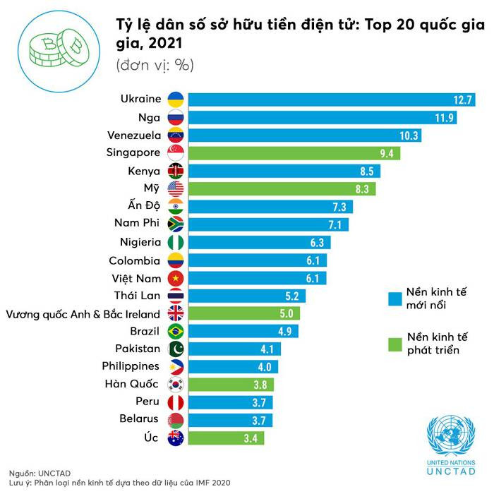 Báo cáo của Hội nghị Liên Hiệp Quốc về Thương mại và Phát triển (UNCTAD) được công bố mới đây cũng cho thấy, khoảng 6,1% dân số Việt Nam đang sở hữu tiền điện tử. Theo đó, Việt Nam xếp thứ 11 trong top 20 quốc gia có tỷ lệ người dân sở hữu tiền điện tử hàng đầu thế giới.
