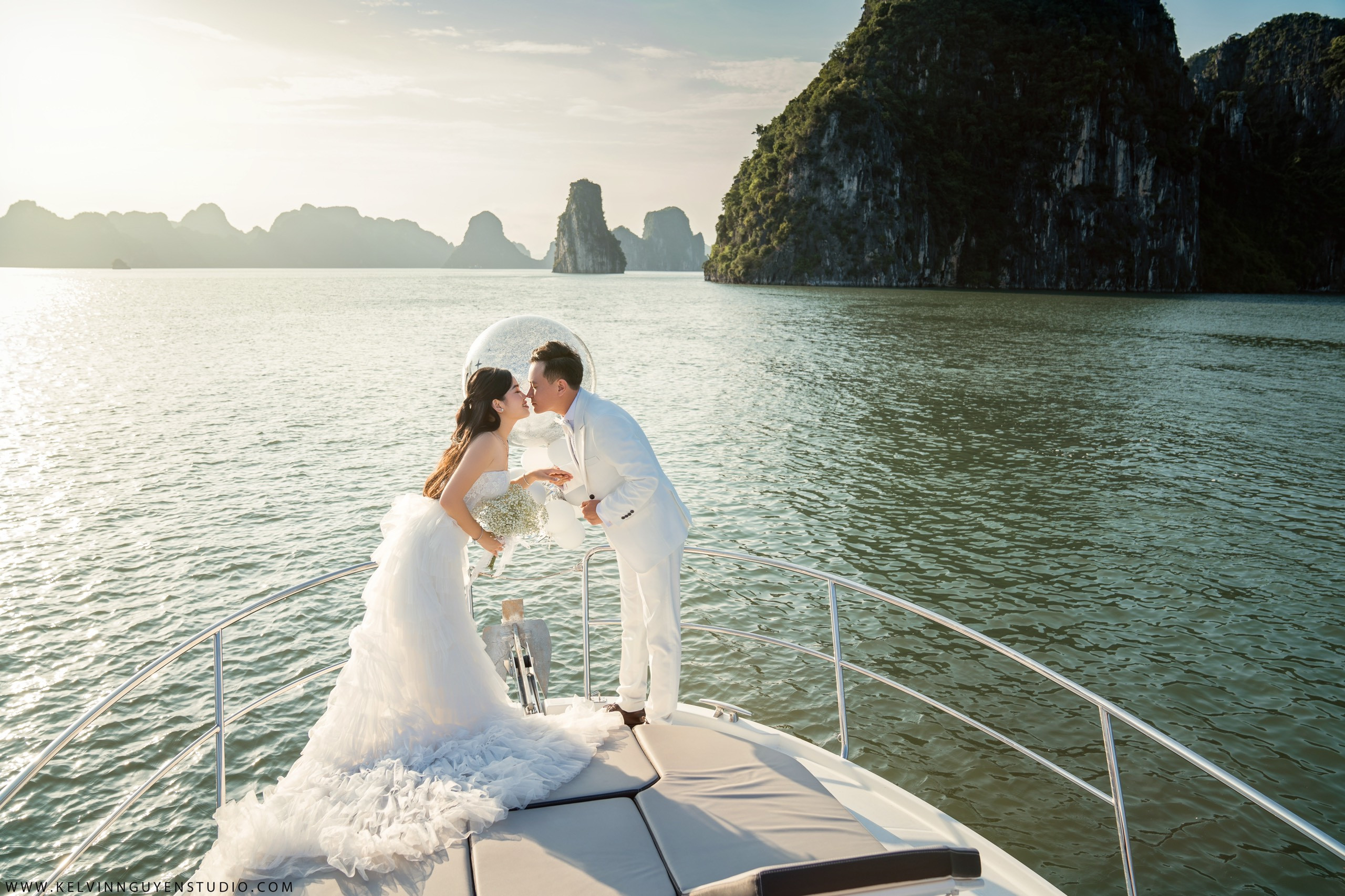 Ở điểm đến nổi tiếng này, ngoài chụp những bức ảnh trong trang phục váy cưới tinh khôi, cặp đôi còn được trải nghiệm đi du thuyền 5 sao, vi vu ngắm khung cảnh biển đảo đẹp như tranh dù lúc sớm tinh mơ hay hoàng hôn.