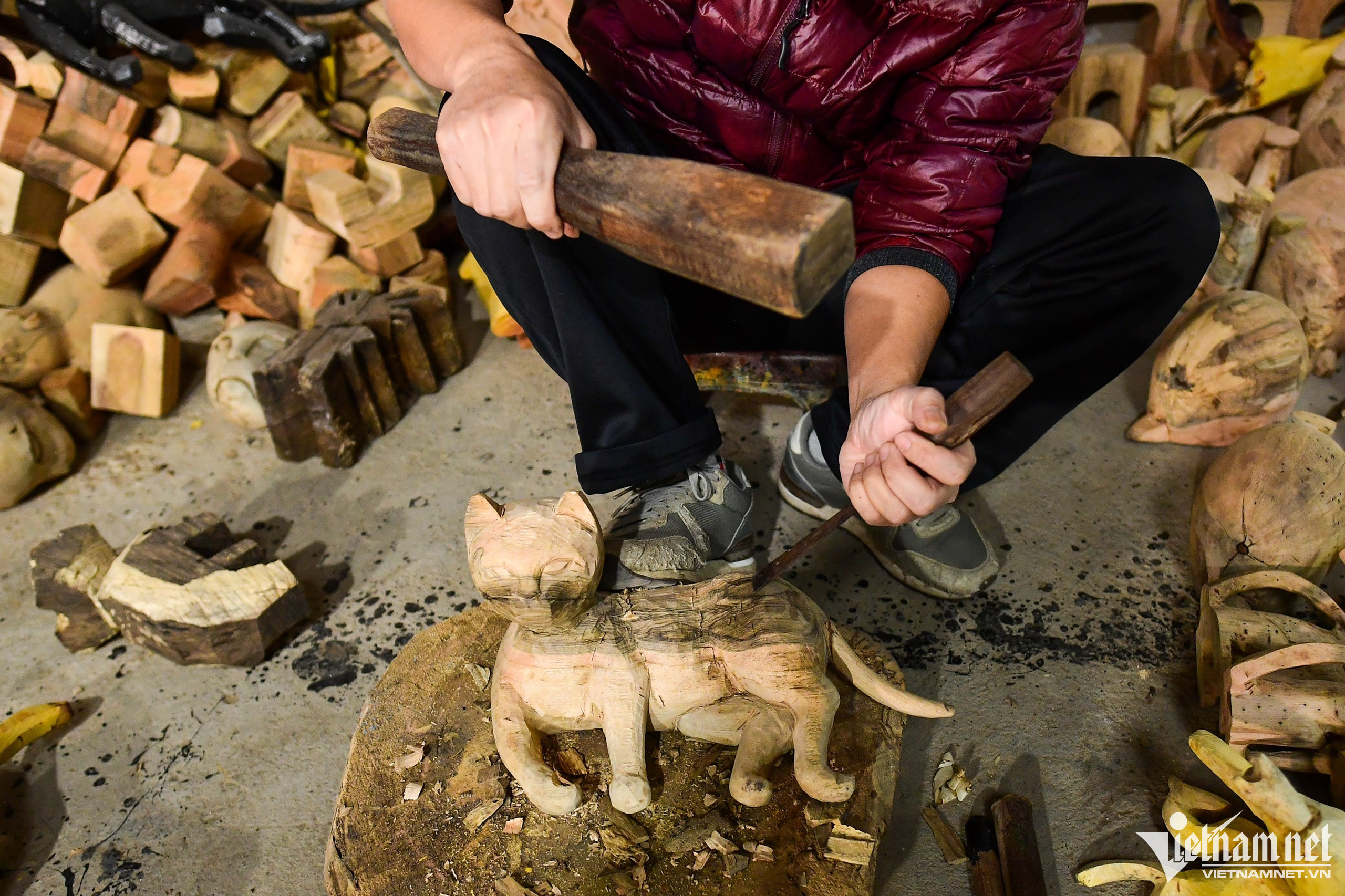 Giáp Tết Quý Mão 2023, anh Nguyễn Tấn Phát (Sơn Tây, Hà Nội) tất bật chế tác dần dần cho đủ 2023 linh vật mèo bằng gỗ mít, vỏ trứng và vỏ trai kết hợp với sơn mài truyền thống.