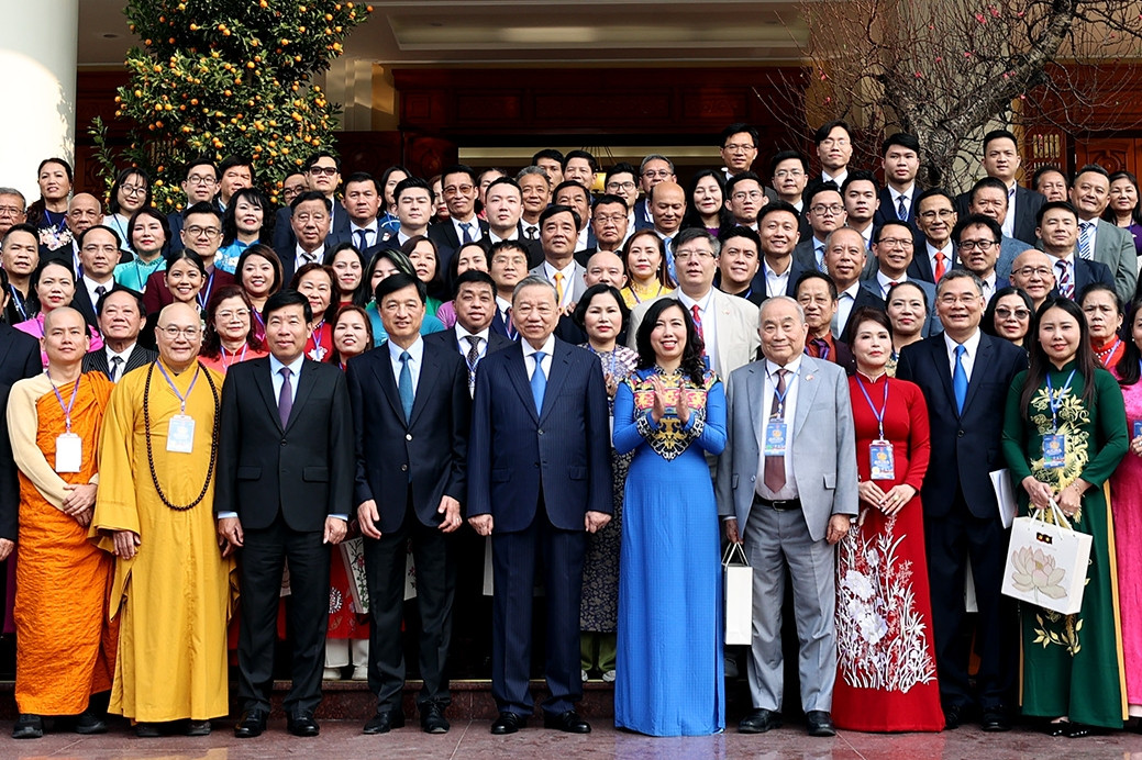 Phát biểu tại buổi gặp mặt, điểm lại những kết quả nổi bật trong năm 2024, thay mặt lãnh đạo Đảng, Nhà nước, Tổng Bí thư Tô Lâm nhấn mạnh năm 2024 có nhiều biến động nhân sự trong Ban lãnh đạo cao cấp của Đảng nhưng Ban Chấp hành Trung ương Đảng, Bộ Chính trị, Ban Bí thư và các cơ quan trong hệ thống chính trị tiếp tục phát huy tinh thần đoàn kết, thống nhất tổ chức thực hiện có hiệu quả các chương trình công tác.