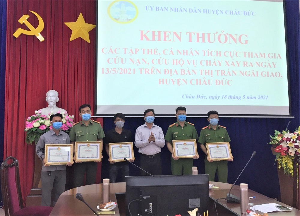 | UBND huyện Châu Đức khen thưởng cho các cá nhân, tập thể tham gia cứu hộ trong vụ cháy. |
