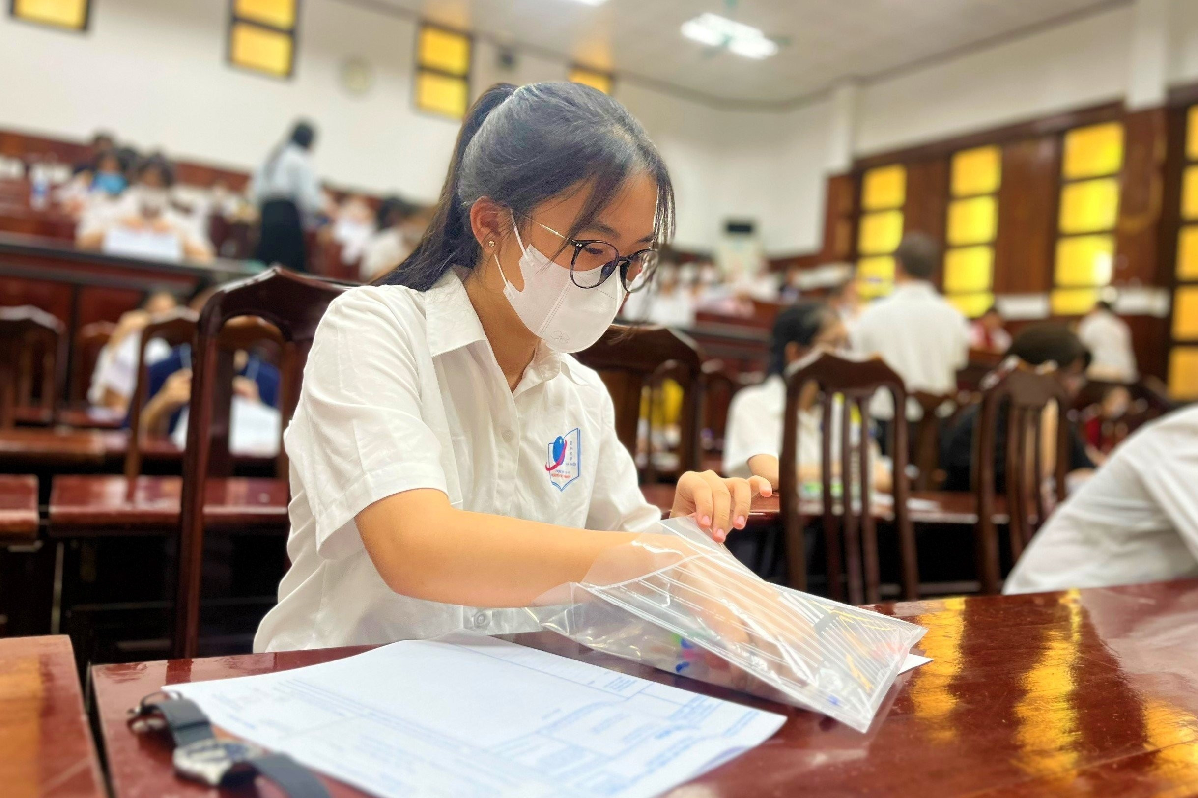 Bùi Minh Anh và mẹ đi từ huyện Mê Linh (Hà Nội) cách điểm thi Trường THPT Chuyên Sư phạm hơn 20km nên em và mẹ ở lại trường để nghỉ ngơi.