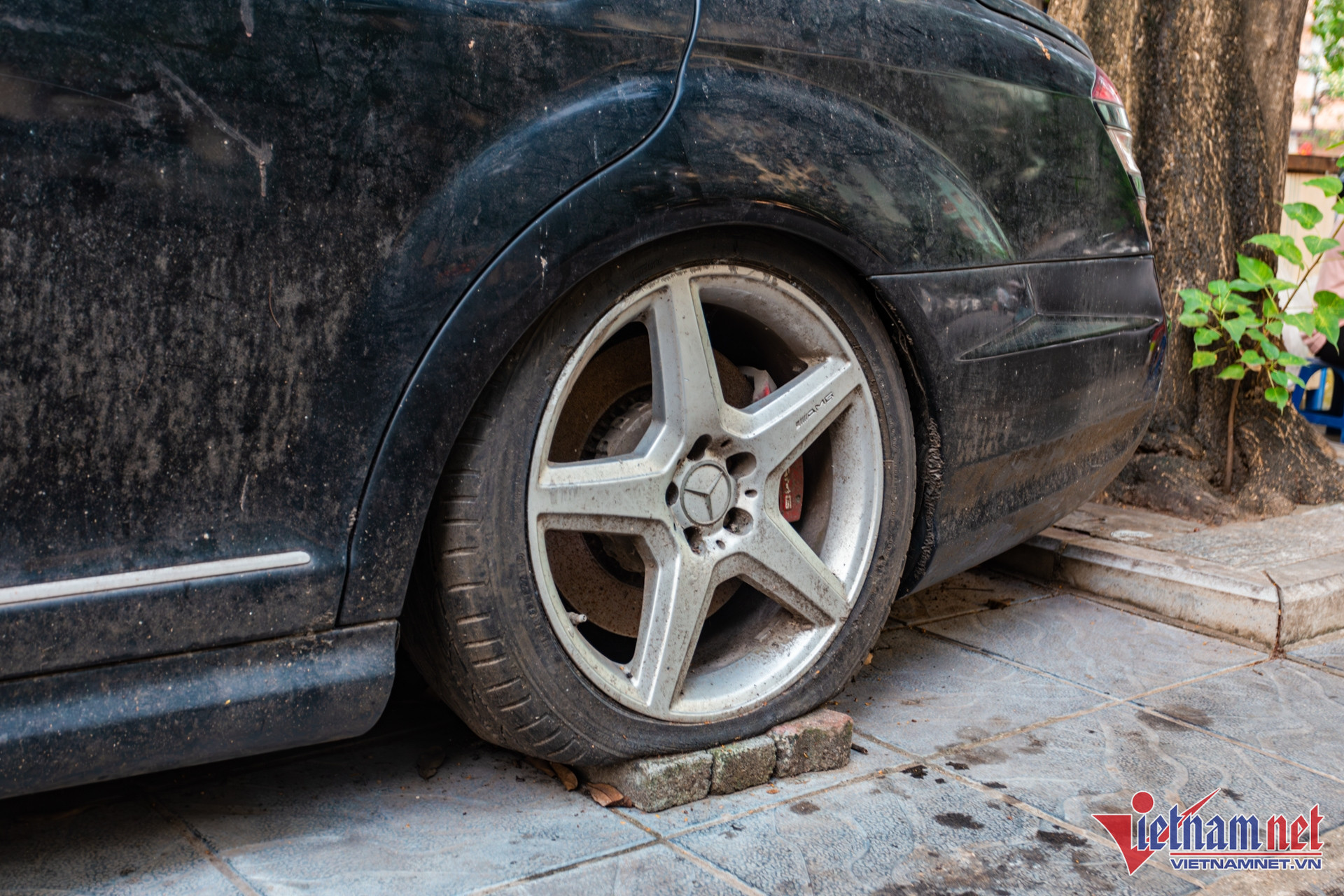 Các lốp xe đều bị xịt từ thời điểm trước năm 2019. Đây là lý do khiến người dân xung quanh quyết định đặt bánh xe trên những viên gạch để tránh cạ gầm vào vỉa hè. Đất bám trên bộ mâm 5 chấu AMG thậm chí đã vón cục. Đĩa phanh bị rỉ sét nghiêm trọng. Cùm phanh AMG bám bụi nhưng vẫn lộ ra màu đỏ nguyên bản.