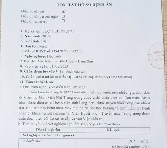 Trong khi đó, anh Lục Duy Anh (SN 1978, bố của Phụng) vốn làm phụ hồ, thu nhập bấp bênh chỉ đủ sinh hoạt. Chị Tuyển đã gác lại ruộng vườn, theo con đi bệnh viện. Từ ngày nhập Viện Huyết học và truyền máu Trung ương cho đến nay, chi phí chữa bệnh đã lên tới gần 300 triệu đồng, trong đó hơn 250 triệu đồng là vay mượn người thân, bạn bè.