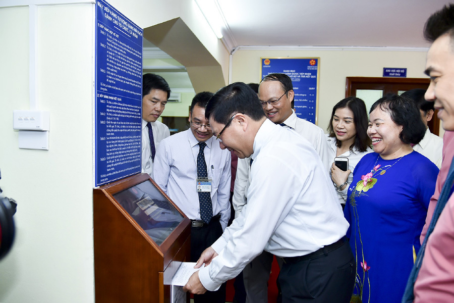 | Phó Thủ tướng và các đại biểu tham quan và trực tiếp thử nghiệm dịch vụ tại bộ phận một cửa |
