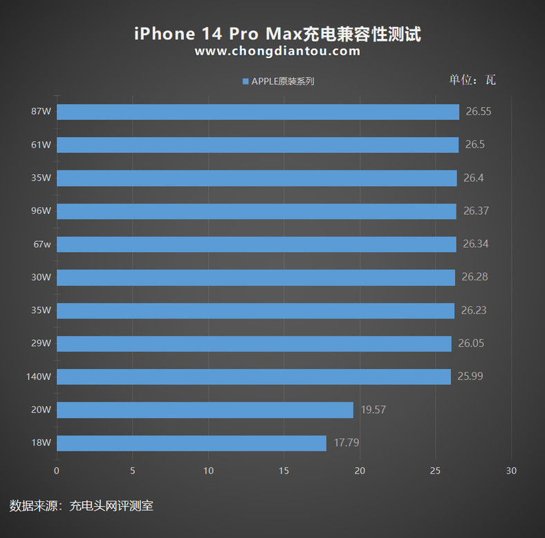 Theo biểu đồ dưới đây, các bộ sạc có công suất 29W hoặc cao hơn của Apple đều có thể sạc iPhone 14 Pro Max ở mức 26W đến gần 27W.