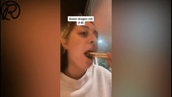 Cô gái ăn hàng chục miếng sushi cùng lúc cho thỏa cơn thèm (Ảnh cắt từ clip). |