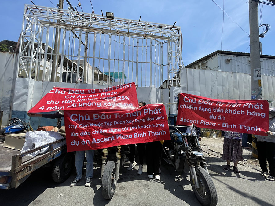 Những băng rôn có nội dung như: “Chủ đầu tư Tiến Phát chiếm dụng tiền của khách hàng dự án Ascent Plaza Bình Thạnh”, “Chủ đầu tư Tiến Phát căn hộ Ascent Plaza thu tiền của khách hàng 25% 4 năm rồi không xây dựng”, “Chúng tôi không chấp nhận thanh lý hợp đồng với đền bù 5% lãi suất. Đề nghị cơ quan chức năng vào cuộc xử lý nghiêm chủ đầu tư Tiến Phát”…