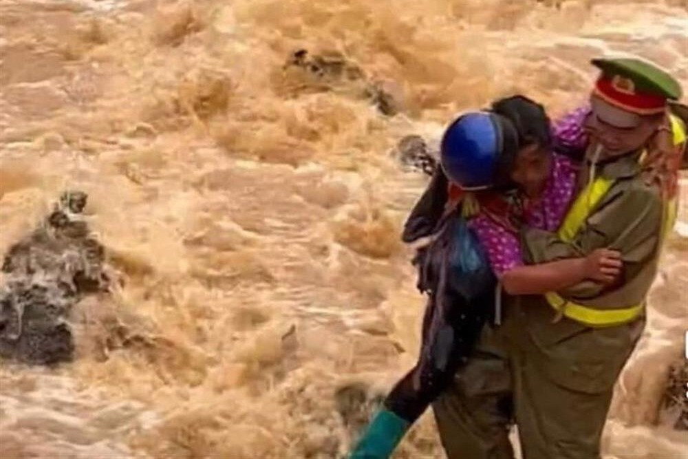 Người còn lại bám được vào tảng đá giữa dòng suối được thượng úy Nguyễn Mạnh Tường cùng đồng đội dùng áo mưa quấn lại để giúp người dân bám vào, đưa lên bờ an toàn.