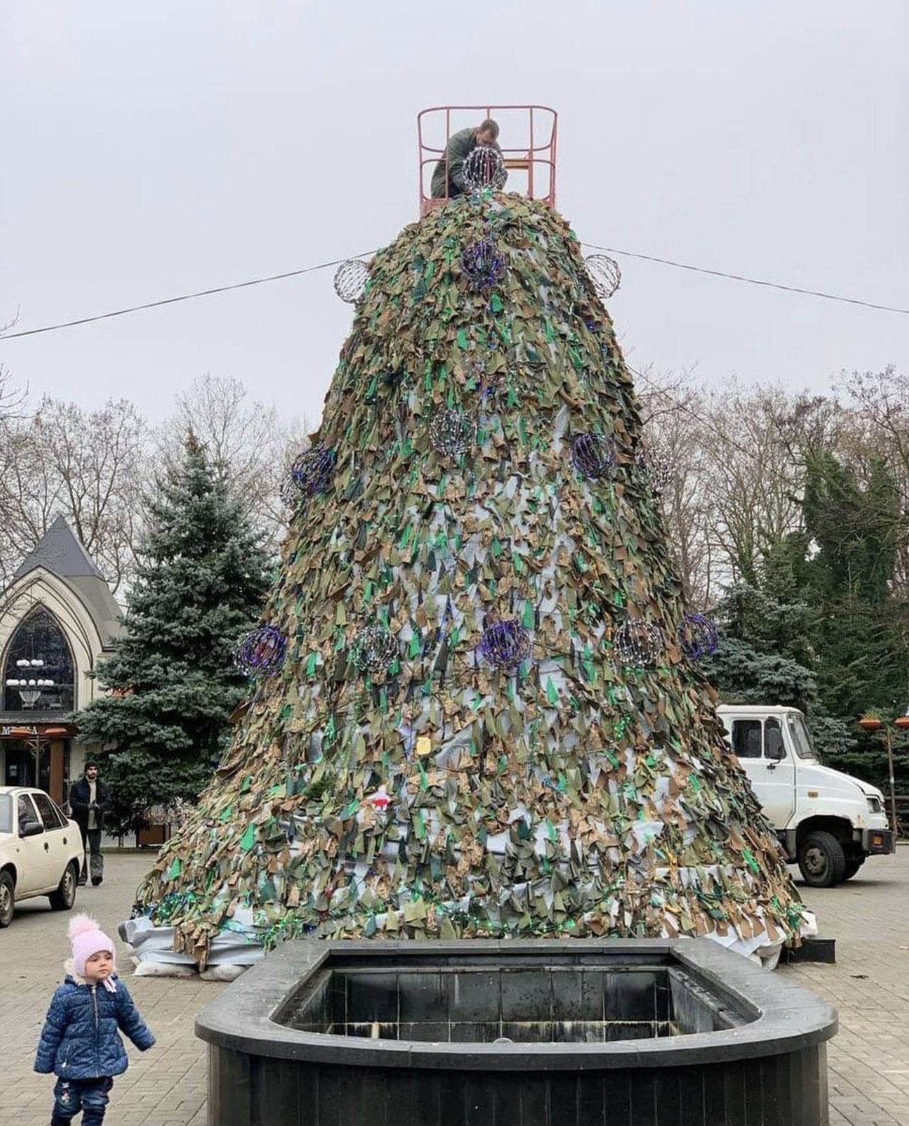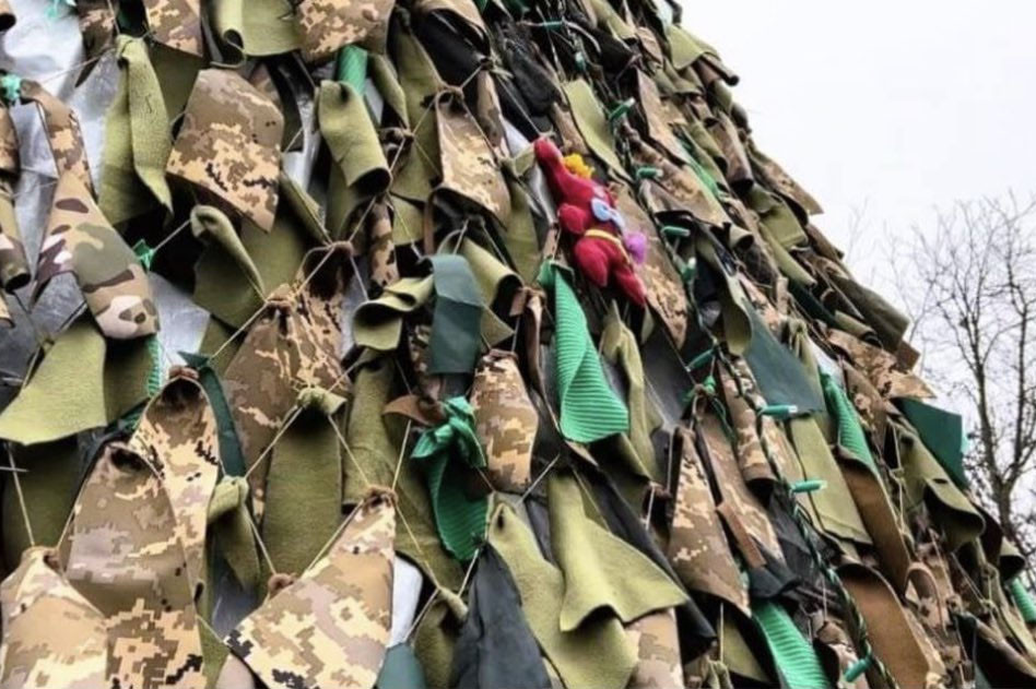 Theo BBC, các tình nguyện viên ở thành phố Mykolaiv, miền nam Ukraine đã làm một cây thông Giáng sinh đặc biệt từ các lưới ngụy trang.