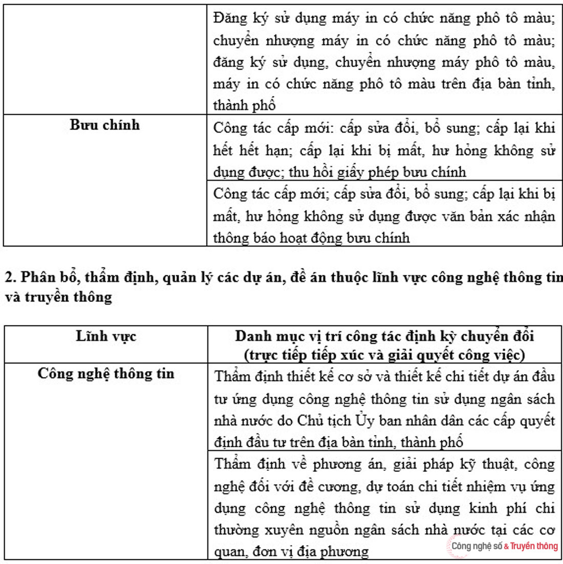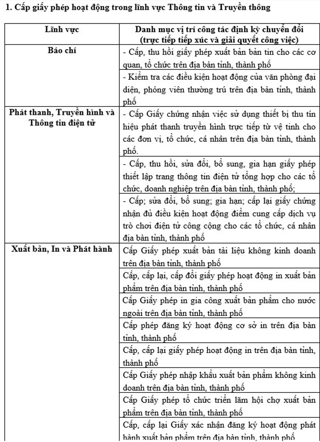 Tại Thông tư mới, Bộ TT&TT quy định cụ thể danh mục các vị trí công tác ở chính quyền địa phương phải định kỳ chuyển đổi như: Cấp, thu hồi giấy phép xuất bản bản tin cho các cơ quan, tổ chức trên địa bàn tỉnh, thành phố (lĩnh vực Báo chí); Công tác cấp mới: cấp sửa đổi, bổ sung; cấp lại khi hết hạn; cấp lại khi bị mất, hư hỏng không sử dụng được; thu hồi giấy phép bưu chính (lĩnh vực Bưu chính); Thẩm định thiết kế cơ sở và thiết kế chi tiết dự án đầu tư ứng dụng công nghệ thông tin sử dụng ngân sách nhà nước do Chủ tịch UBND các cấp quyết định đầu tư trên địa bàn tỉnh, thành phố (lĩnh vực CNTT)…