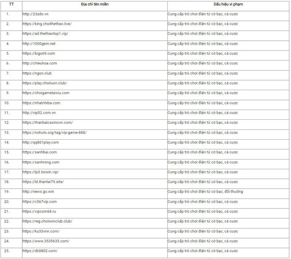 Danh sách các trang thông tin điện tử có dấu hiệu vi phạm pháp luật mới được Bộ TT&TT công bố gồm có: 23zdo.vn, king.choithethao.live, ad.thethaotop1.vip, 1000gem.net, bigo69.com, chieuhoa.com, ngon.club, play.choiluon.club, choigametaixiu.com, choigametaixiu.com, nhatnhiba.com, vip52.com.vn, thanbaicasinovn.com, nohuto.org/tag/vip-game-888, qq801play.com, sanhbai.com, sanhrong.com, lp3.toiwin.vip, ld.thantai79.site, news.go.win, c567vip.com, vipcom68.ru, reg.choiiwinclub.club, ku33vnn.com, 3535635.com và dk8802.com.