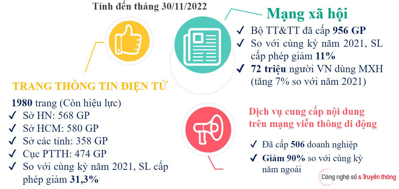 Bà Nguyễn Thị Thanh Huyền, Trưởng phòng Thông tin điện tử, Cục Phát thanh Truyền hình và Thông tin điện tử (PTTH&TTĐT) cho biết, tính đến cuối tháng 11, số lượng trang thông tin điện tử, mạng xã hội, cung cấp dịch vụ nội dung trên mạng viễn thông di động cũng như trò chơi điện tử trên mạng được cấp phép đều giảm.