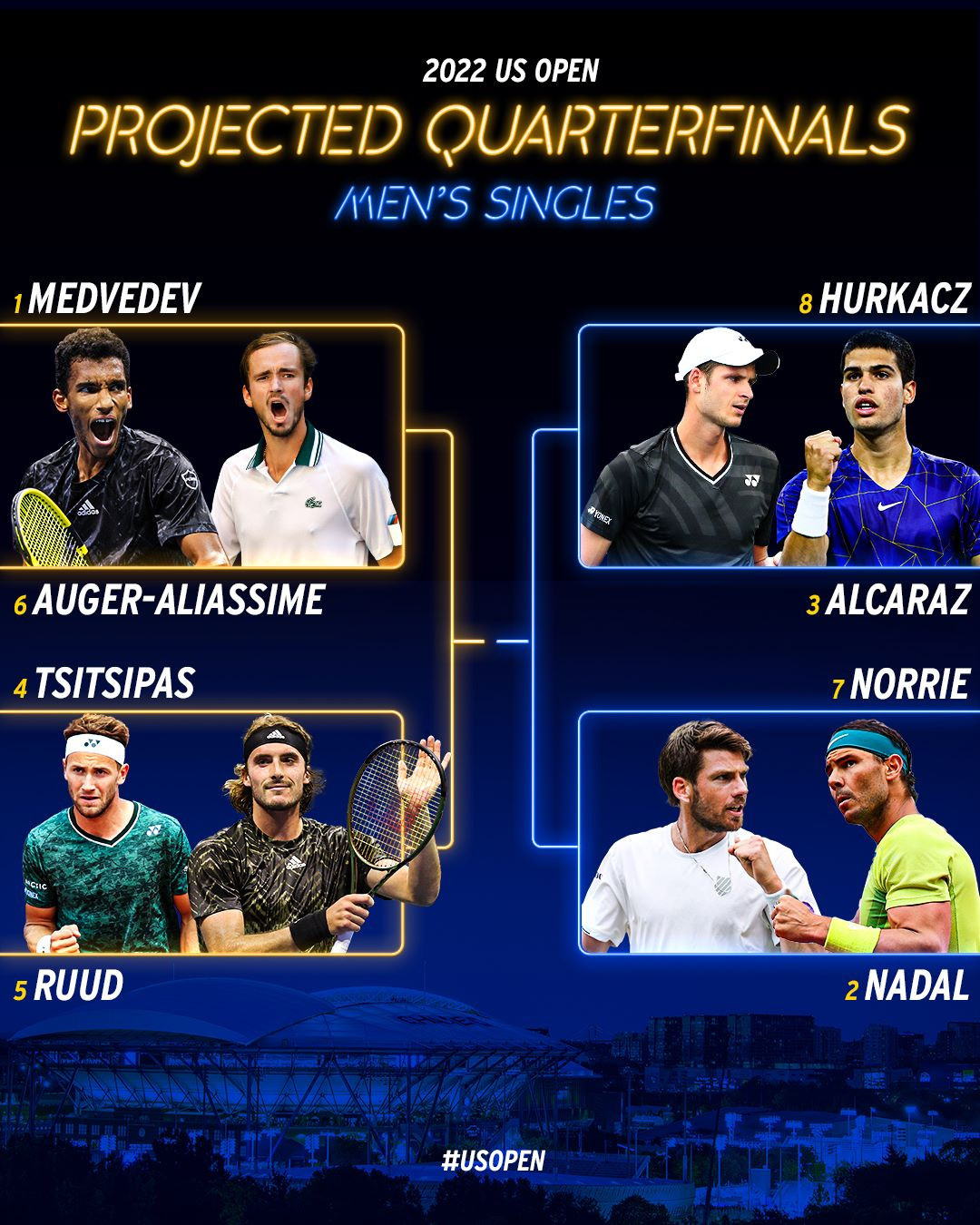 Trên hành trình bảo vệ ngôi vương tại US Open, nhà ĐKVĐ có thể chạm trán hạt giống số 16 người Tây Ban Nha Roberto Bautista Agut ở vòng 4. Tại tứ kết, Medvedev nhiều khả năng đối đầu hạt giống số 6 Felix Auger-Aliassime, rồi Stefanos Tsitsipas ở bán kết.