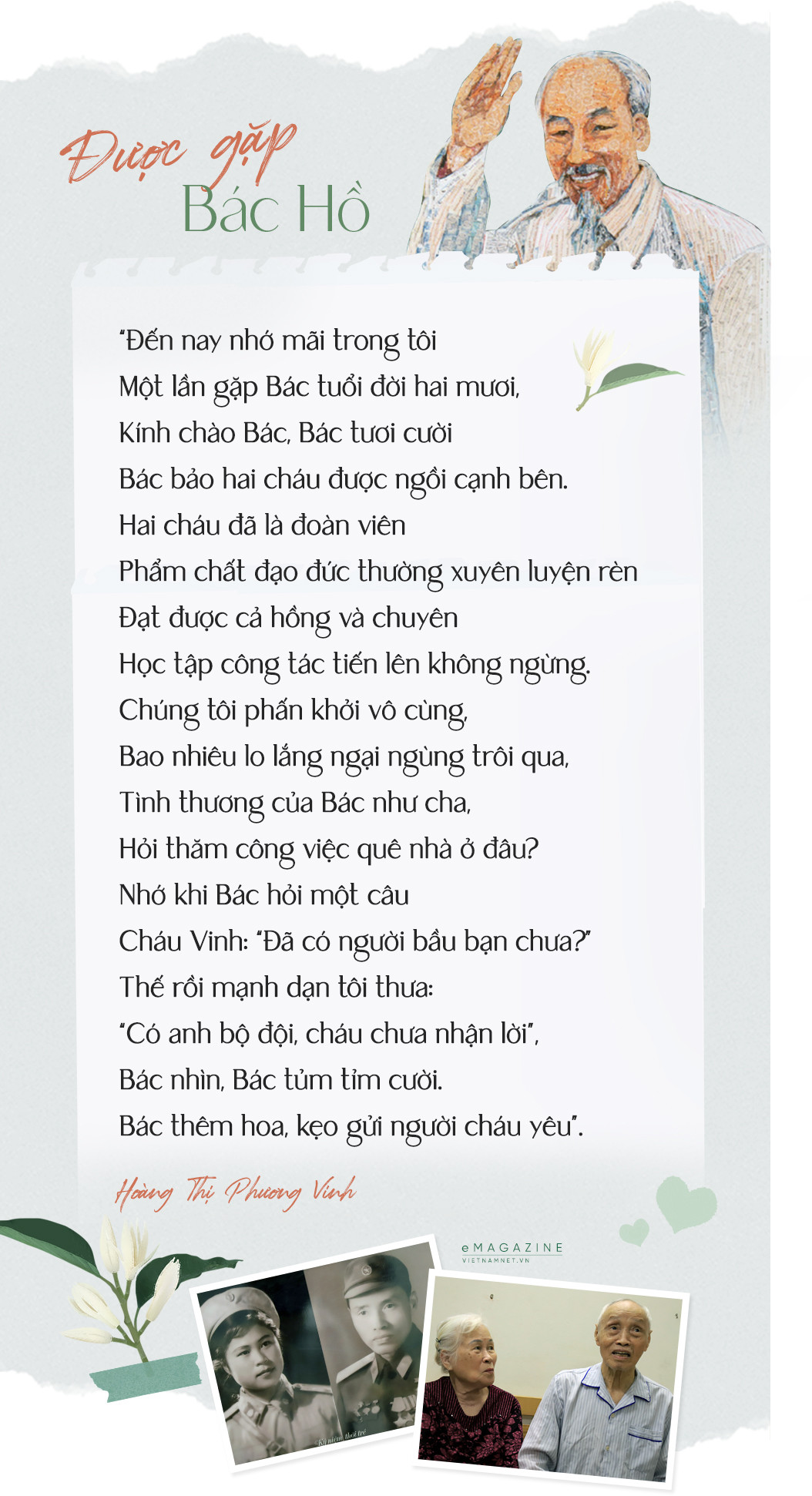 Bà Vinh tủm tỉm cười nhớ lại kỷ niệm đẹp trong lần gặp Bác: “Lúc chuẩn bị ra về, chú Kỳ mới thưa với Bác rằng ‘bé Vinh đã có bạn rồi’, tôi mới xấu hổ quá nói “Chú!” - mặt đỏ bừng ngại ngùng chỉ thốt ra được một câu với chú Kỳ. Bác Hồ thấy thế liền bảo ‘À thế có bạn thì thêm một phần nữa”. Phương Vinh thẹn thùng giới thiệu với Bác đó là bộ đội từng chiến đấu ở Điện Biên Phủ, nay đang học văn hóa ở Lạng Sơn.
