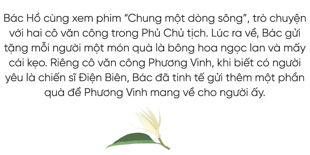 Hai người đi hai bên, vì sợ trời mưa nên Tuấn Hồng cầm ô, còn Phương Vinh cầm khăn để quàng cho Bác đỡ lạnh. Mấy Bác cháu và các cán bộ trong phủ ngồi trong phòng xem bộ phim “Chung một dòng sông”.