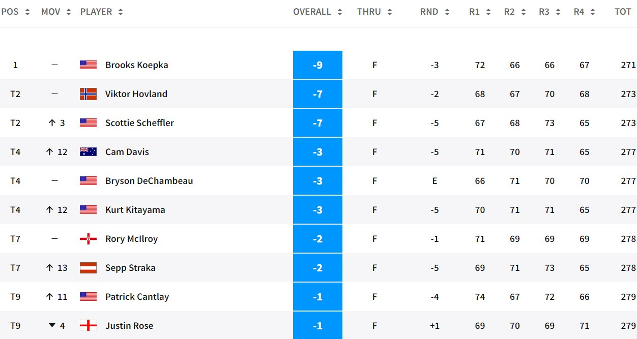 Bất chấp sự bám đuổi của Viktor Hovland, cũng như màn bứt phá vòng cuối của Scottie Scheffler, Koepka vẫn duy trì ngôi đầu bảng để nâng cao danh hiệu với tổng điểm -9. Trên đường đi, anh thực hiện 18 birdie cùng với 9 bogey.