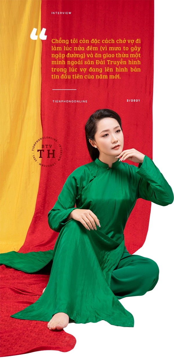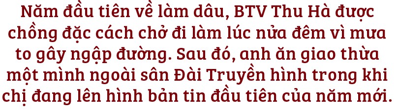 Tết năm vừa rồi có đôi chút đặc biệt vì tôi đã đi làm dâu, nhưng rất may vẫn được chồng và gia đình chồng thông cảm. Chồng tôi còn đặc cách chở vợ đi làm lúc nửa đêm (vì mưa to gây ngập đường) và ăn giao thừa một mình ngoài sân Đài Truyền hình trong lúc vợ đang lên hình bản tin đầu tiên của năm mới.