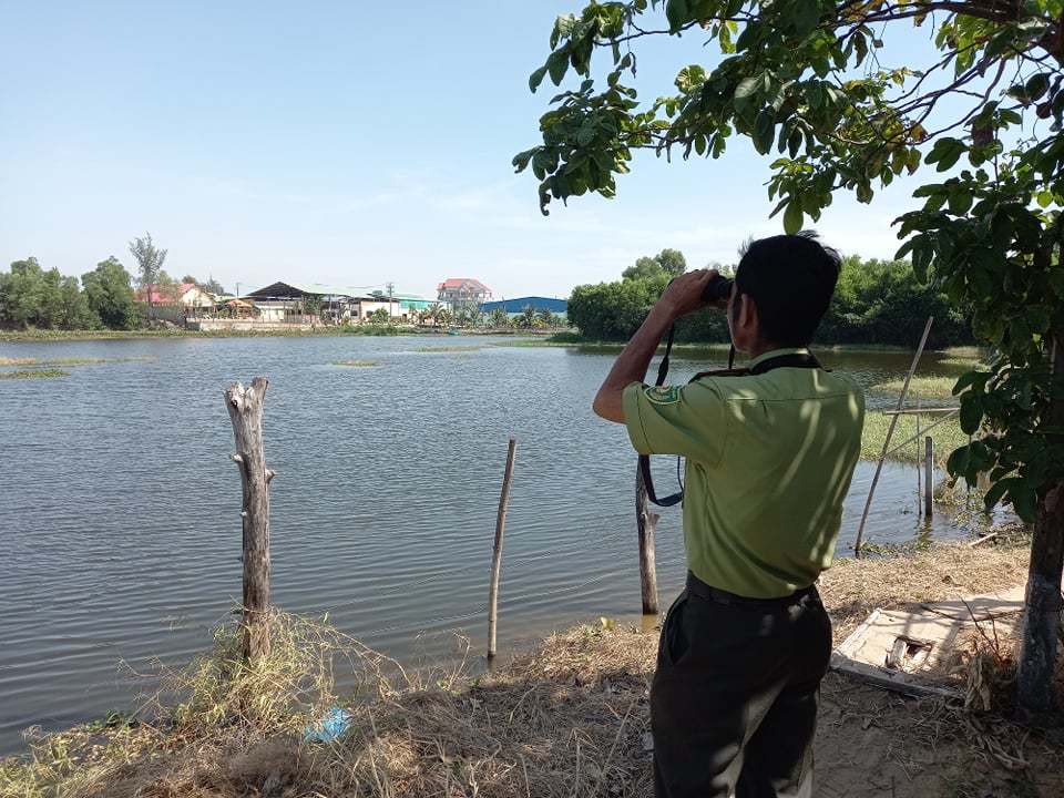 | Cán bộ kiểm lâm dùng ống nhòm để xác định vị trí cá sấu ngoi lên mặt nước |