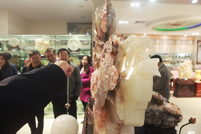 Một khách hàng từ Hà Nội đến xem, hỏi mua. Vị khách này lấy một con lắc để sát vào bức tranh ngọc