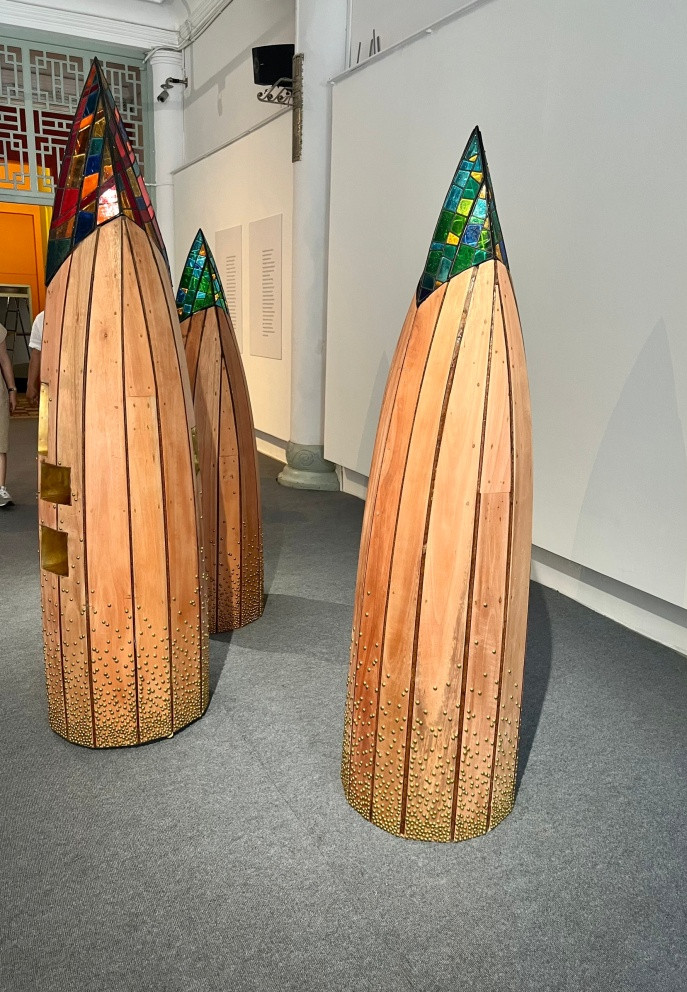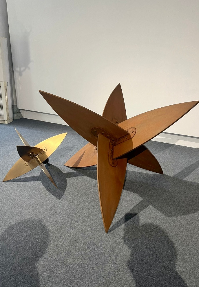 9 tác phẩm với 2 chất liệu chính là kim loại inox và gỗ cây sao (loại gỗ dùng để đóng thuyền – PV) được điêu khắc gia sử dụng cho quá trình sáng tạo. Trong đó, gỗ là hạt lúa và kim loại được ông lý giải là những con sông chở nặng phù sa.