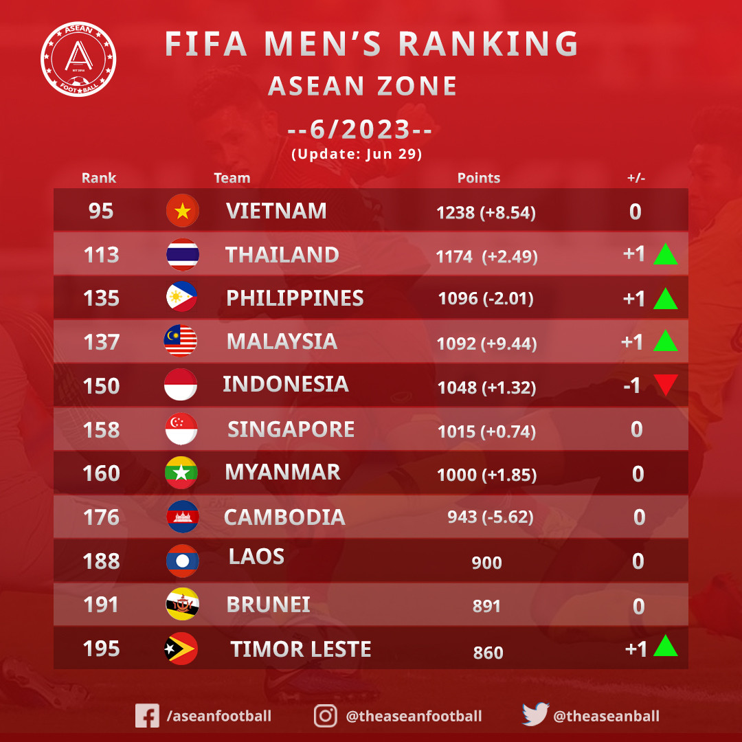 Cũng ở khu vực Đông Nam Á, ngoài “Voi chiến”, Philippines (135), Malaysia (137) và Timor Leste (195) cùng tăng một bậc, Indonesia (150) giảm một bậc, các đội tuyển còn lại giữ nguyên vị trí.
