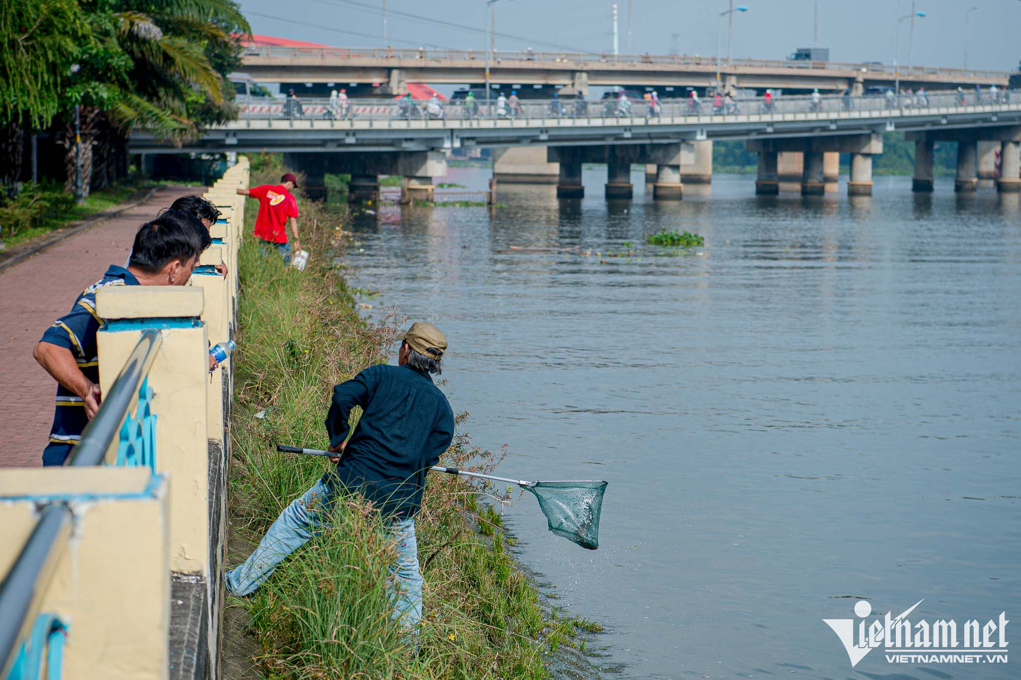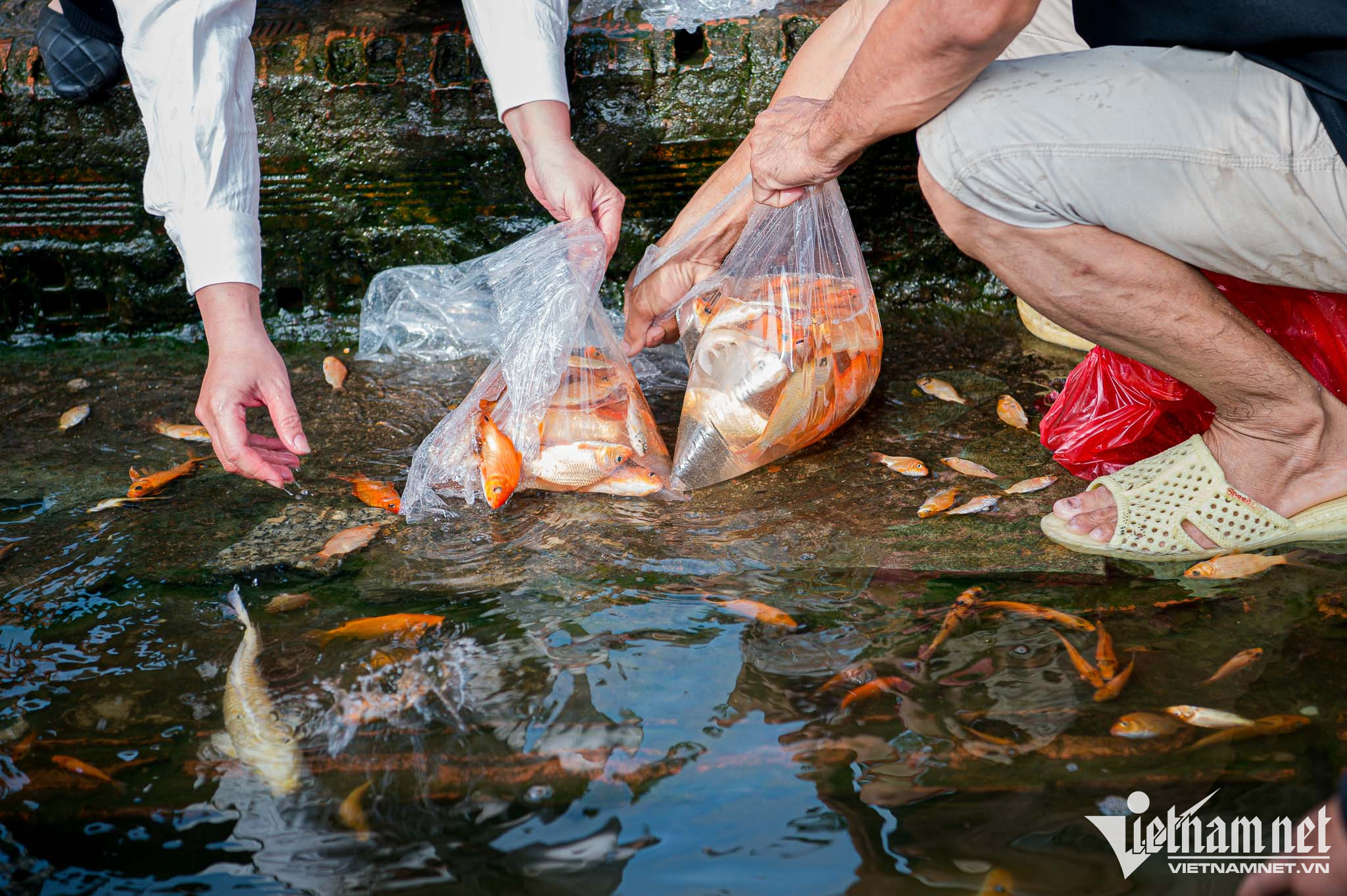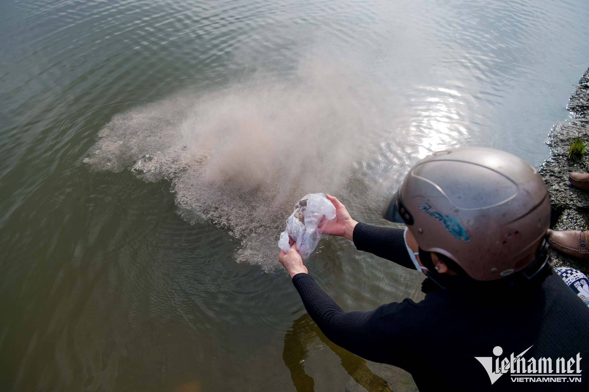 Sáng 23 tháng Chạp, nhiều người dân mua số lượng lớn cá mang đến khu vực chùa Diệu Pháp, TP.HCM để phóng sinh. Nhiều bịch có tới cả trăm con được thả cùng một lúc.