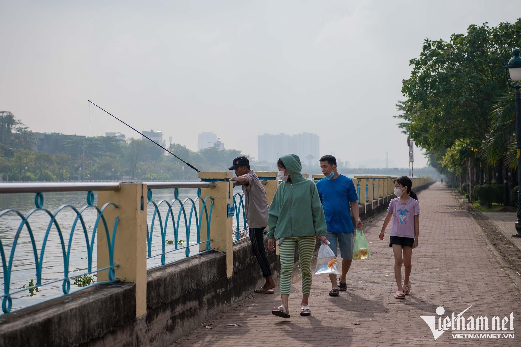 Chị Khánh (Thủ Đức, TP.HCM) đưa cậu con trai đi cùng thả cá. Năm nay gia đình chọn sông Sài Gòn thay vì "làm thủ tục" ngay gần nhà như mọi năm.