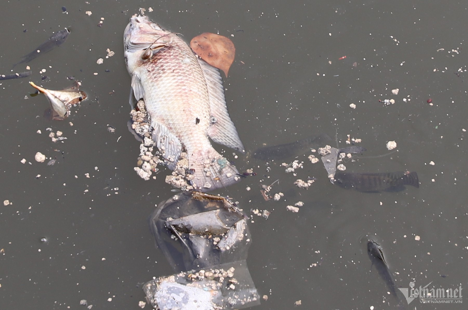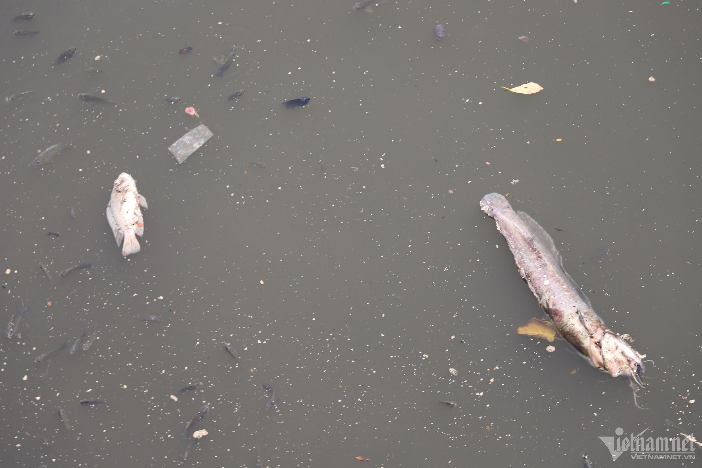 Cá chết xen lẫn với rác nổi lềnh bềnh trên mặt nước.