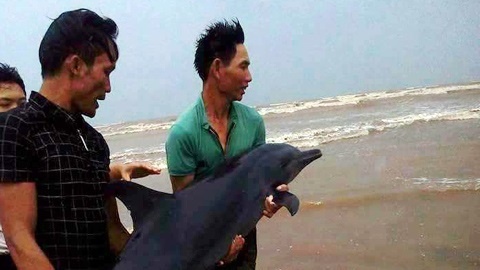 Sáng nay, người dân ở xã Diễn Hải, huyện Diễn Châu (Nghệ An) phát hiện một con cá heo mắc cạn ở bãi biển và tiến hành giải cứu.