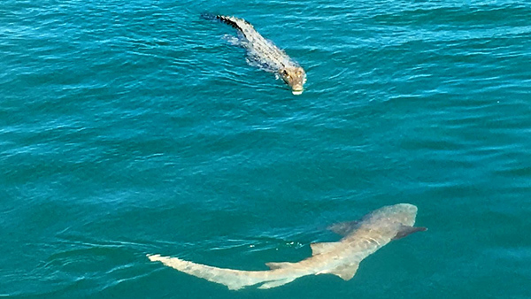 Một cặp đôi đi câu trên biển đã tình cờ ghi lại được cuộc chạm trán giữa con cá sấu và cặp đôi cá mập trắng.
