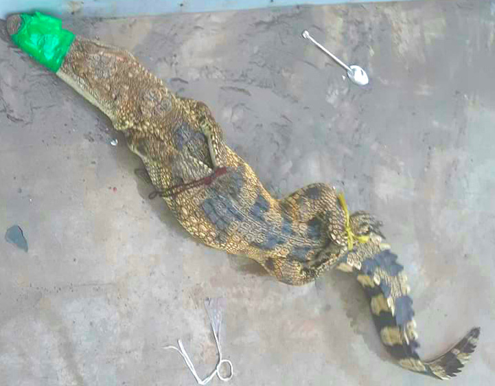 Cá sấu dài gần 2m miệng bị buộc chặt bò trên quốc lộ 1