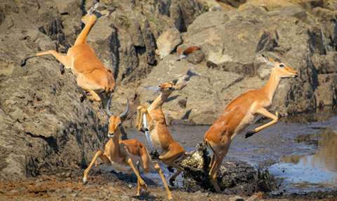 Khoảnh khắc ngoạn mục bầy linh dương tung mình trên không thoát cú đớp điện giật của cá sấu được nhà nhiếp ảnh nghiệp dư John Mullineux, ghi lại tại công viên quốc gia Kruger, Nam Phi.