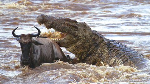 Con linh dương đầu bò đơn độc vượt sông không may lọt giữa bầy cá sấu đói. Nó nhanh chóng "biến mất" dưới lòng sông chỉ trong vài phút.