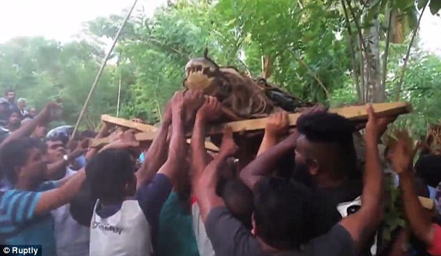 Toàn bộ đàn ông lực lưỡng tại một ngôi làng ở Sri Lanka đã được huy động để khiêng một con cá sấu dài 5m.