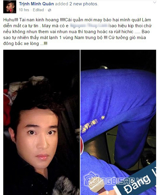 Minh Quân lại có kỷ niệm đáng nhớ trên sân khấu. Trong lúc hát 'sung', quần của Minh Quân đã bất ngờ rách toạc.
