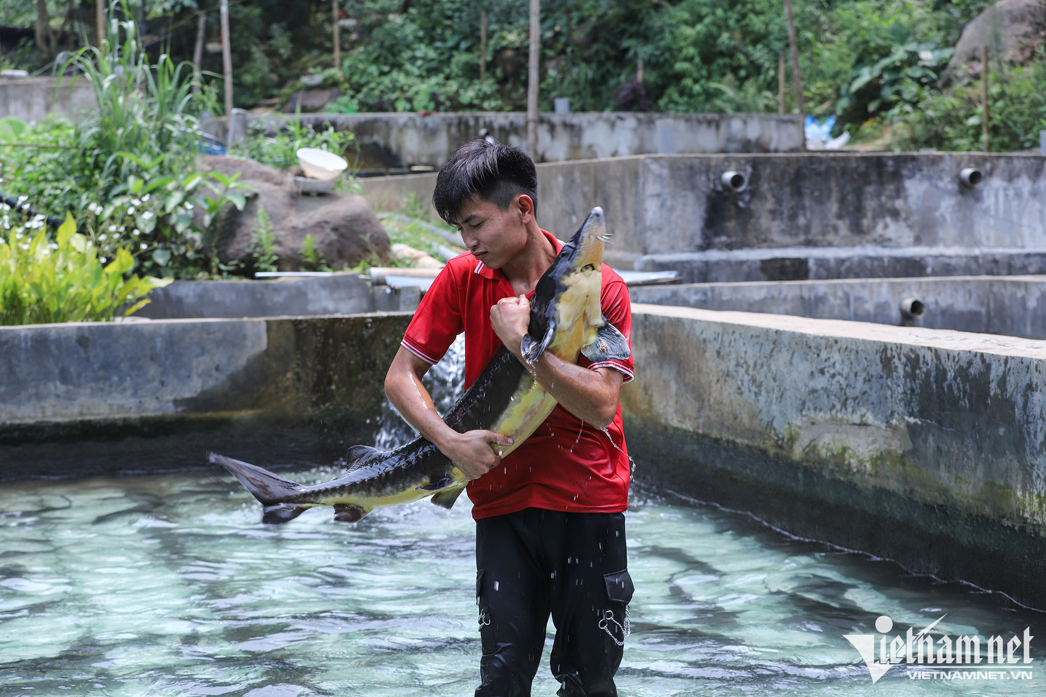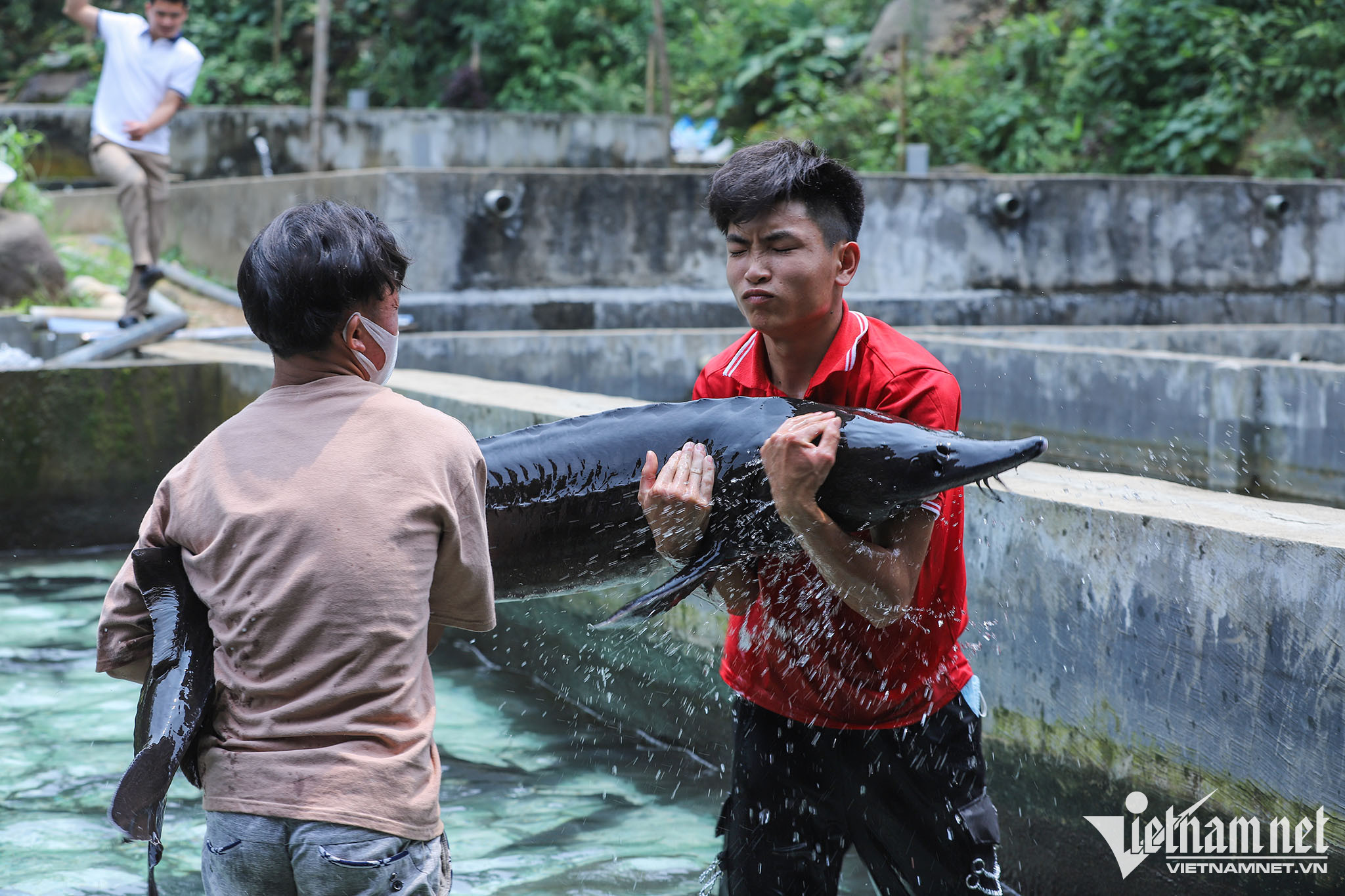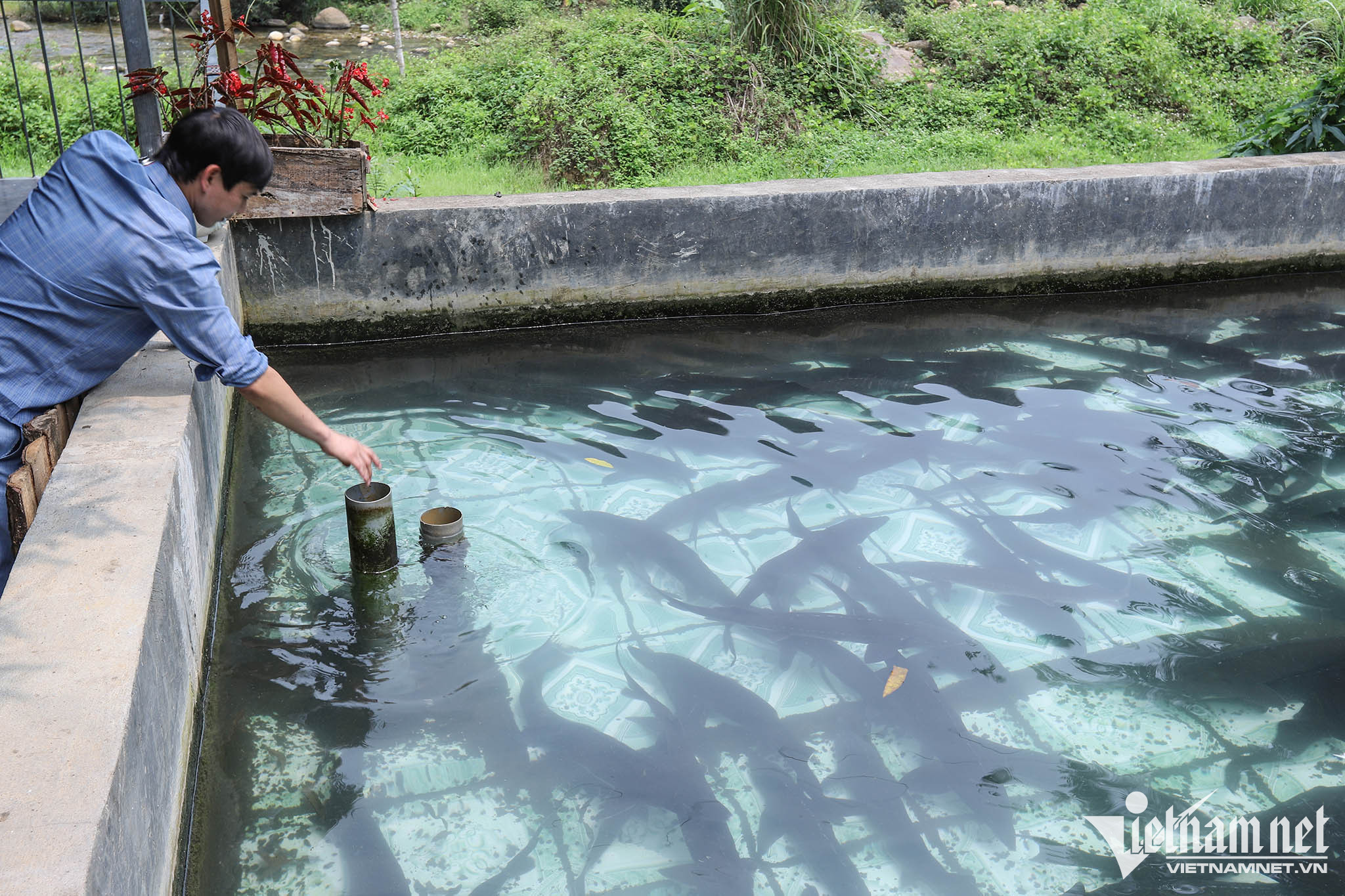 Anh Bình cho biết, trước đây Hợp tác xã có 4 con cá tầm kích thước trên 40kg, nhưng đã được bán cho khách ở nhiều nơi. Hiện chỉ còn lại duy nhất một con.