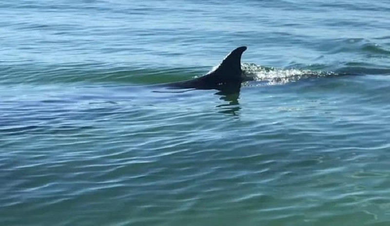 Một người dân chứng kiến sự việc cho biết, cá voi có chiều dài khoảng 7m, nặng khoảng 5 tấn, bơi chậm rãi, tung tăng trong nước biển.