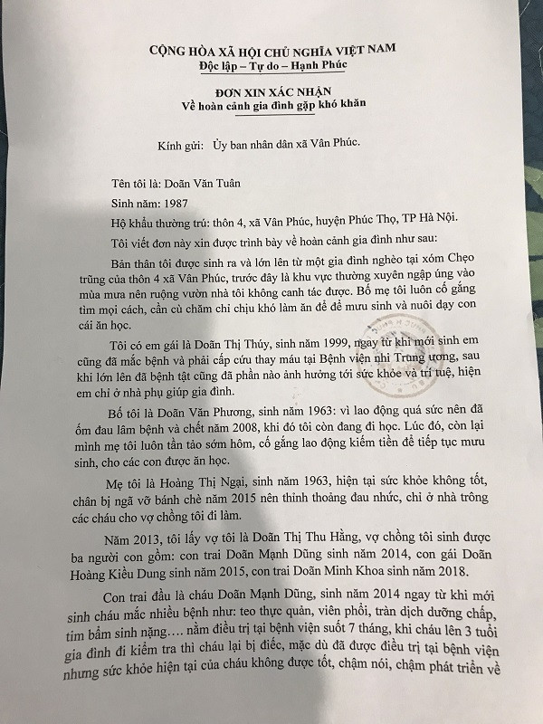 Nhiều năm nay, cuộc sống của vợ chồng anh Doãn Văn Tuân và chị Doãn Thị Thu Hằng (ở Phúc Thọ, Hà Nội) chưa khi nào hết khổ. Lần lượt người thân, con cái mắc bệnh hiểm nghèo khiến kinh tế vốn khó khăn lại càng thêm chật vật. Mới ở độ tuổi 30, khuôn mặt chị Hằng trông đã già trước tuổi, bởi nỗi lo lắng về con cái chưa khi nào vơi.