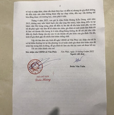 Mọi sự giúp đỡ xin gửi về: 1. Gửi trực tiếp: Chị Doãn Thị Thu Hằng. Địa chỉ: Thôn 4 xã Vân Phúc, huyện Phúc Thọ, Thành phố Hà Nội. Số điện thoại: 0987863141. 2. Ủng hộ qua Báo VietNamNet: Ghi rõ ủng hộ MS 2022.162 (Doãn Hoàng Kiều Dung) Chuyển khoản: Báo VIETNAMNET Số tài khoản: 0011002643148. Sở giao dịch Ngân hàng Ngoại Thương Việt Nam - 198 Trần Quang Khải, Hà Nội - Chuyển khoản từ nước ngoài: Bank account: Báo VIETNAMNET - The currency of bank account: 0011002643148 - Bank:- BANK FOR FOREIGN TRADE OF VIETNAM - Address: 198 Tran Quang Khai, Hanoi,Vietnam - SWIFT code: BFTVVNV X - Qua TK ngân hàng Vietinbank: Chuyển khoản: Báo VietNamNet Số tài khoản: 114000161718 Ngân hàng TMCP Công Thương Việt Nam - Chi nhánh Đống Đa - Chuyển tiền từ nước ngoài: Vietnam Joint Stock Commercial Bank for Industry and Trade, Dong Da Branch - Address: 183 Nguyễn Lương Bằng, quận Đống Đa, Hà Nội - Swift code: ICBVVNVX126 3. Hoặc trực tiếp báo VietNamNet: - Phía Bắc địa chỉ: tầng 3, tòa nhà C’Land,156 Xã Đàn 2, phường Nam Đồng, quận Đống Đa, Hà Nội. - Phía Nam: Văn phòng đại diện báo VietNamNet phía Nam, số 408 Điện Biên Phủ, P11,Q10, TP.HCM. Điện thoại: 19001081. |