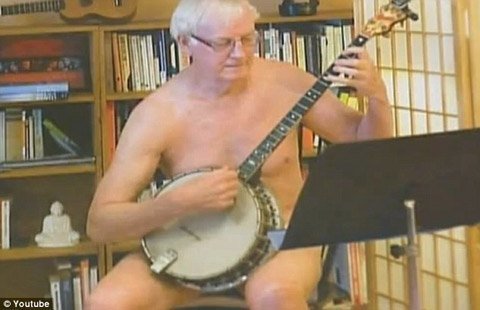 Một cụ ông chụp ảnh trong tư thế chơi đàn banjo |
