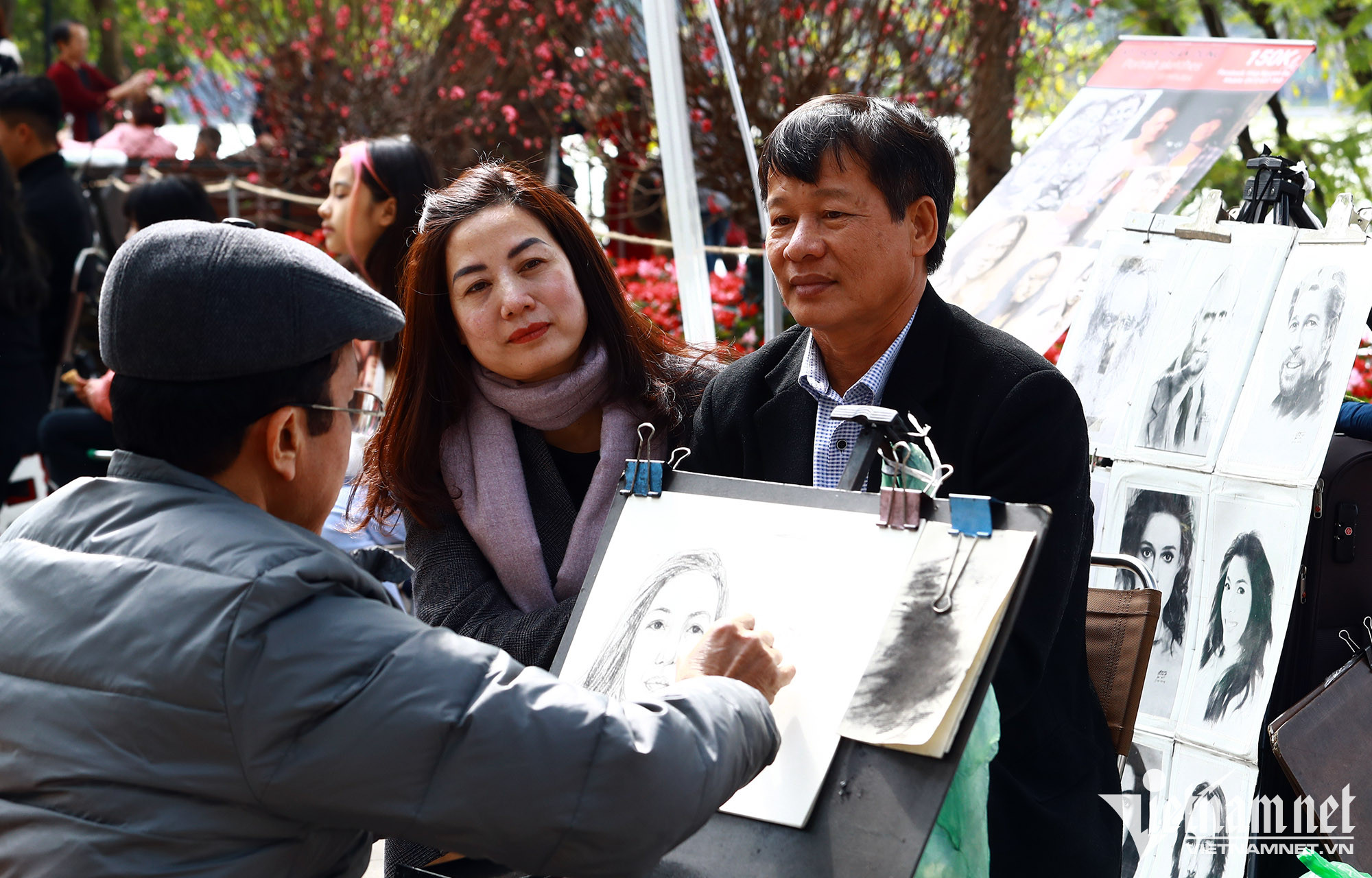 Gia đình anh Thuần, chị Quyên dạo chơi phố đi bộ hồ Gươm rồi tranh thủ ngồi làm mẫu vẽ tranh truyền thần làm kỷ niệm.